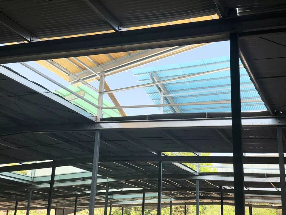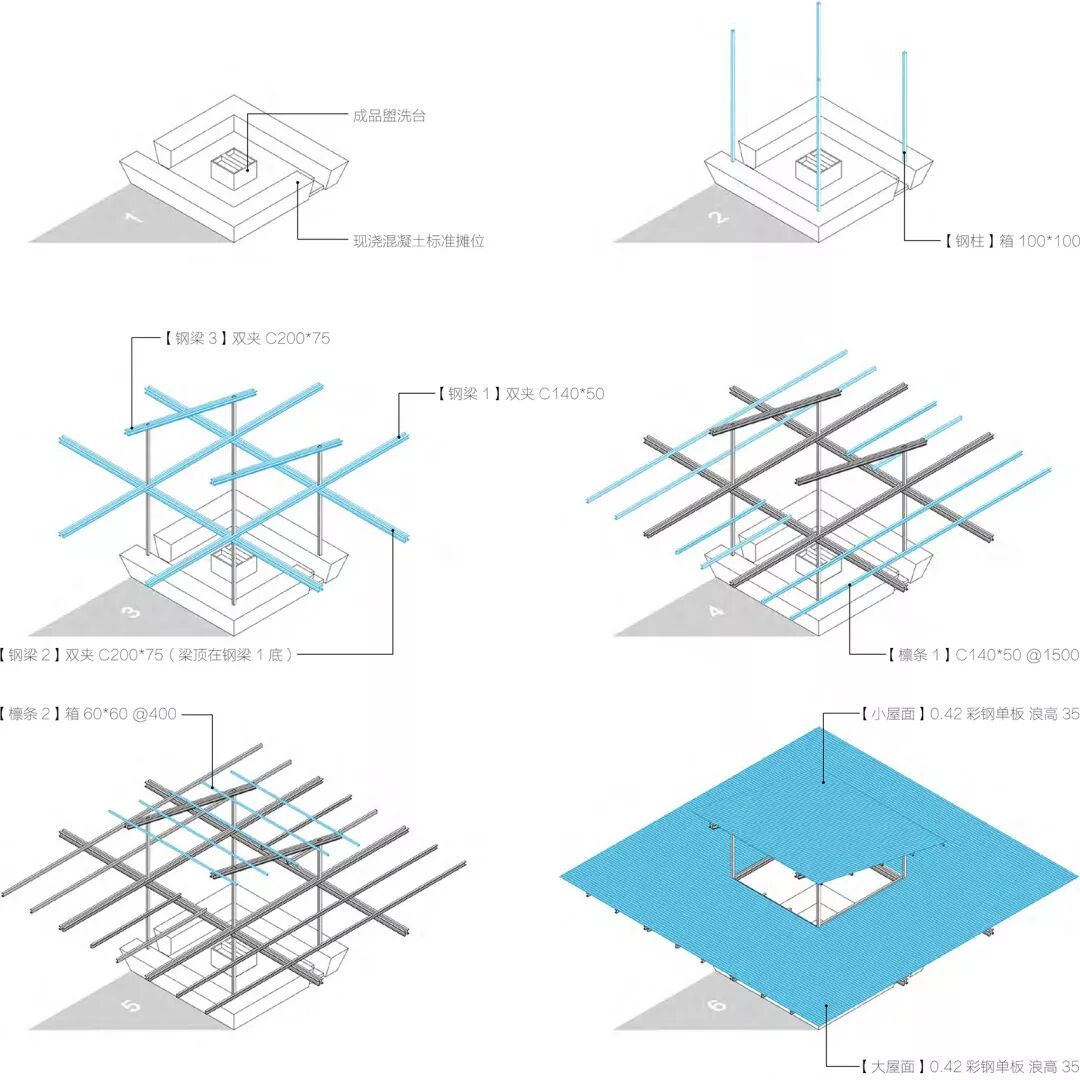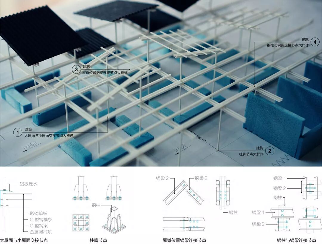 农贸市场主要由钢结构搭建。在梁柱的交接上:采用双夹C型钢梁从两侧分别铆接在钢柱上,且主梁与次梁在高度上错开。这样的连接方式不仅方便施工,更使得各构件保持独立完整,结构逻辑清晰易读。