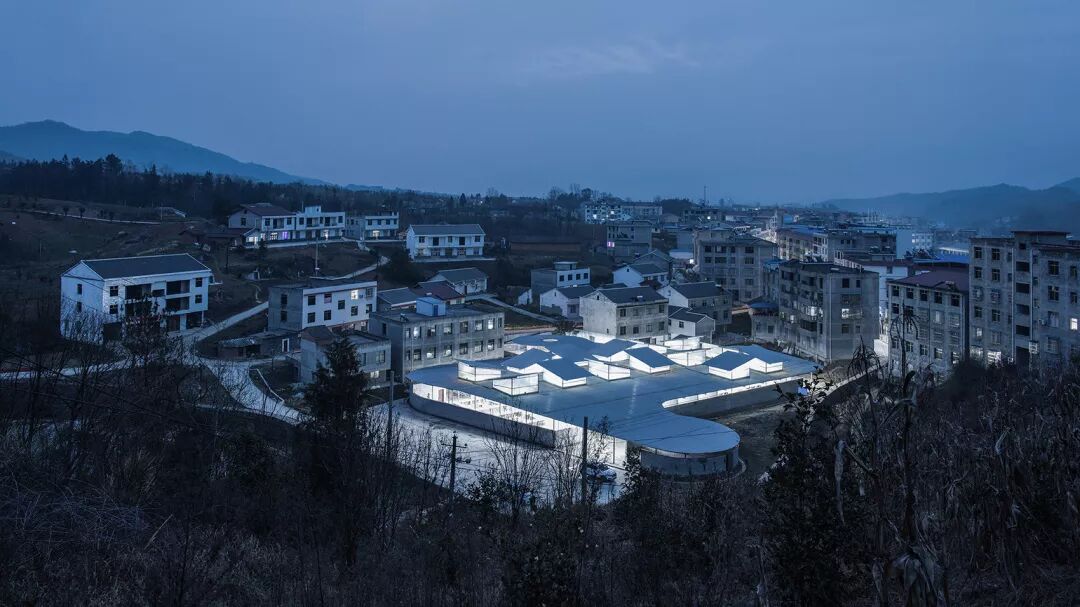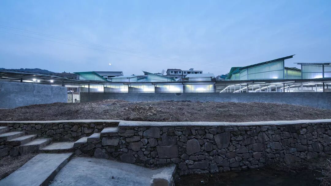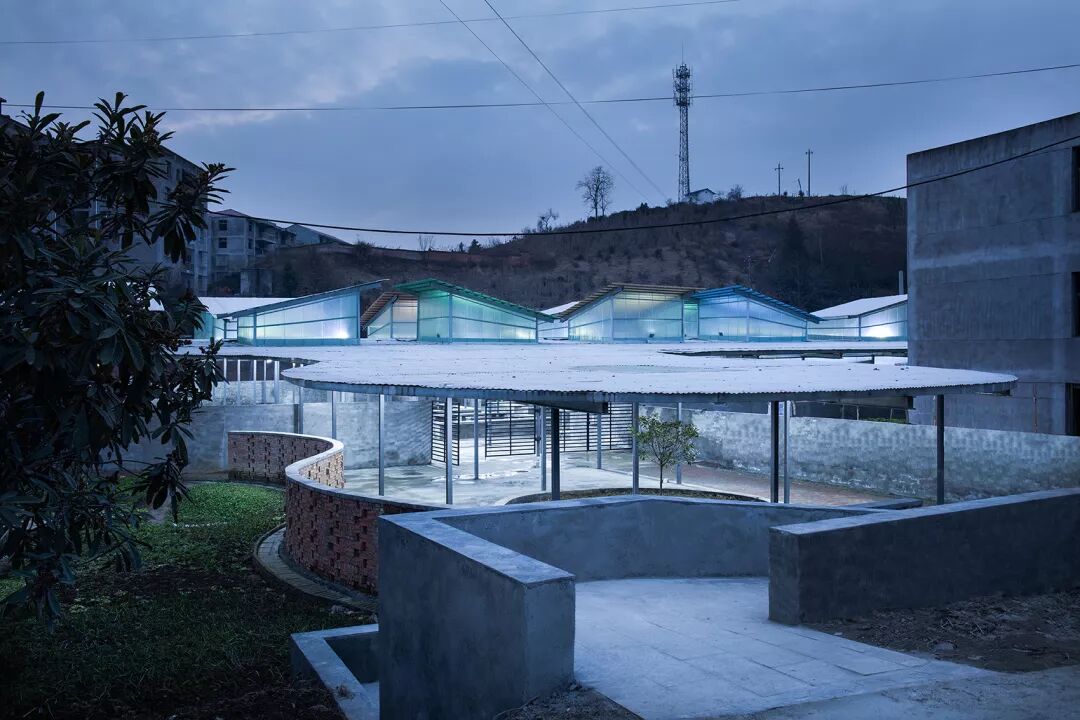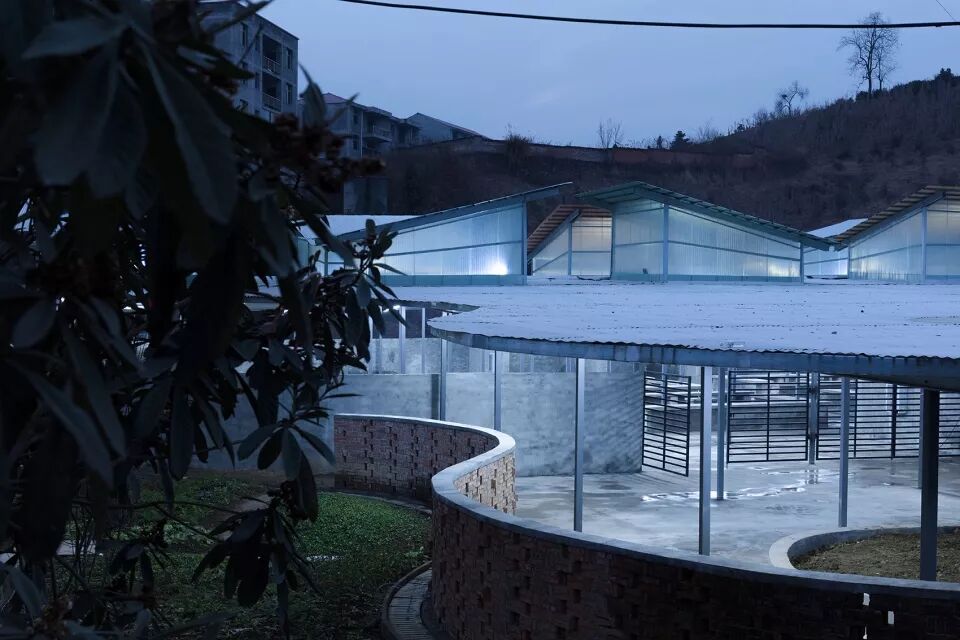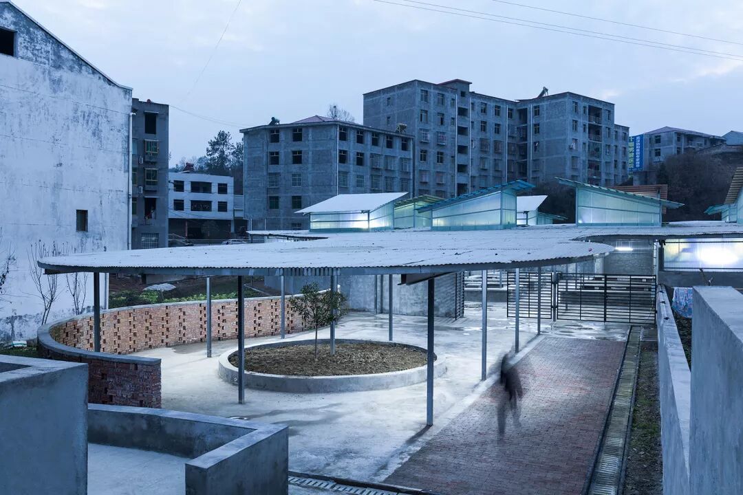 最后,利用其它的辅助功能来和复杂的周遭环境做“推手”:在主入口处用矮墙围合出前广场,柔和的填充民宅间的缝隙;垃圾站与厕所置于远离居住区的北面,顺应水渠蜿蜒的方向探出建筑主体。