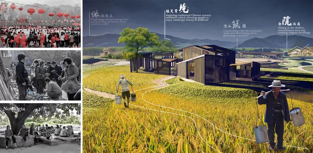 该项目以关注低成本社区景观的可持续发展为出发点,同时,重构早已破裂的人地关系,唤醒人们对自然、对生活的美好回忆与向往,以环境景观为媒体拉近人与人的距离,唤起那美好的乡愁。