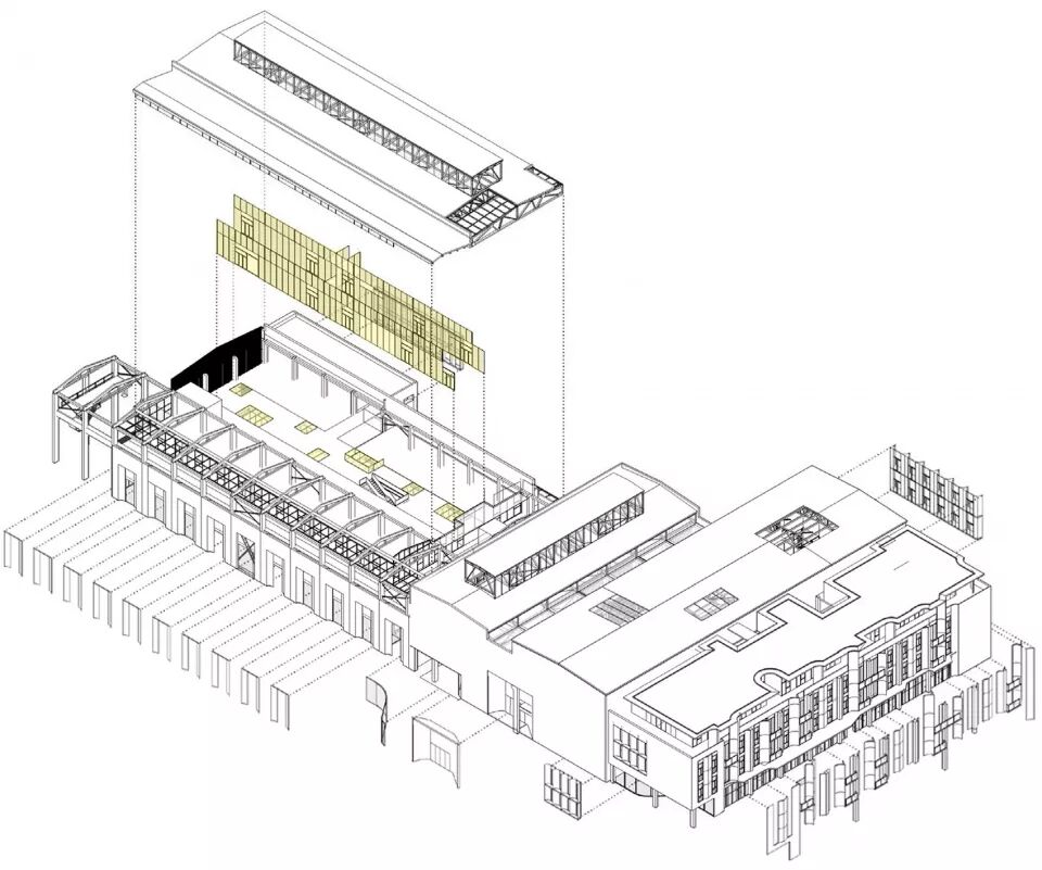 从与原有建筑空间和结构的对话开始,挖掘置入的新功能空间的主题特征,在自身合理组织的同时也时刻跟原有结构体系产生碰撞与磨合。最后,通过对原有结构的局部退让、包裹、强化等空间关系处理,让充满序列感的结构体系暴露在城市空间中。