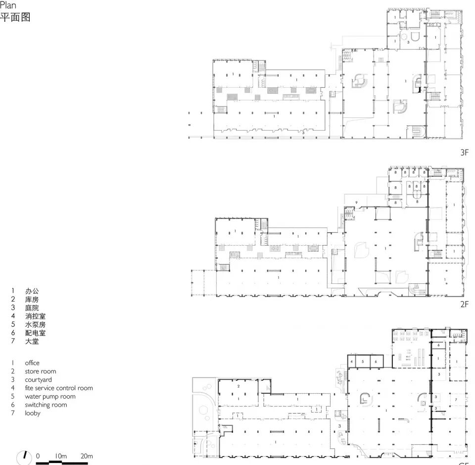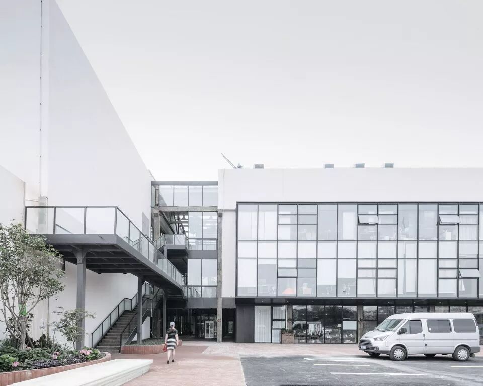 外部景观从前场穿越至后场,被分为东区与西区两部分,以解决厂房占地过大的压力,也便于建筑功能布局的分组与节奏;同时全方位地解决厂房大进深无法满足日常使用的昏暗光线问题。