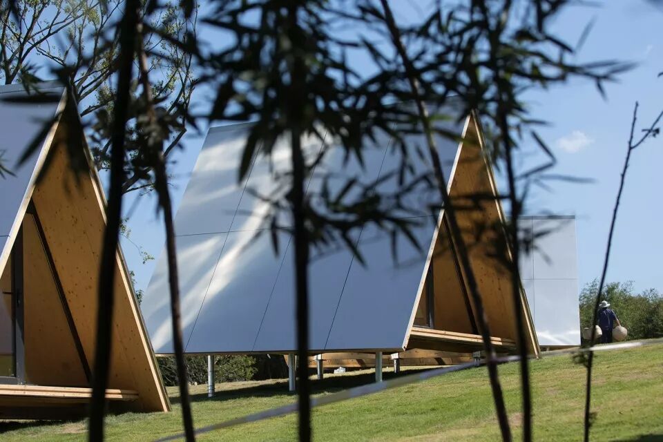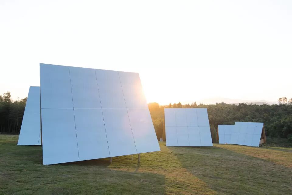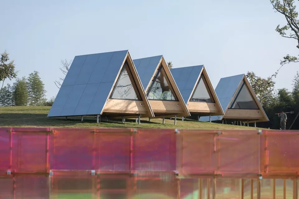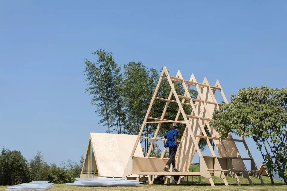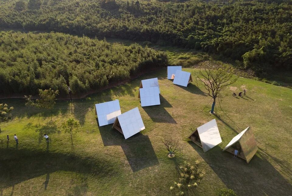 小小部落的三角屋由德国进口的CLT木板拼装而成,我们希望通过带有不同反射性能的屋面一改木屋之于公众的传统印象,环境会不断成为建筑的一部分,光线会左右建筑的呈现。
