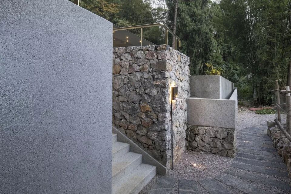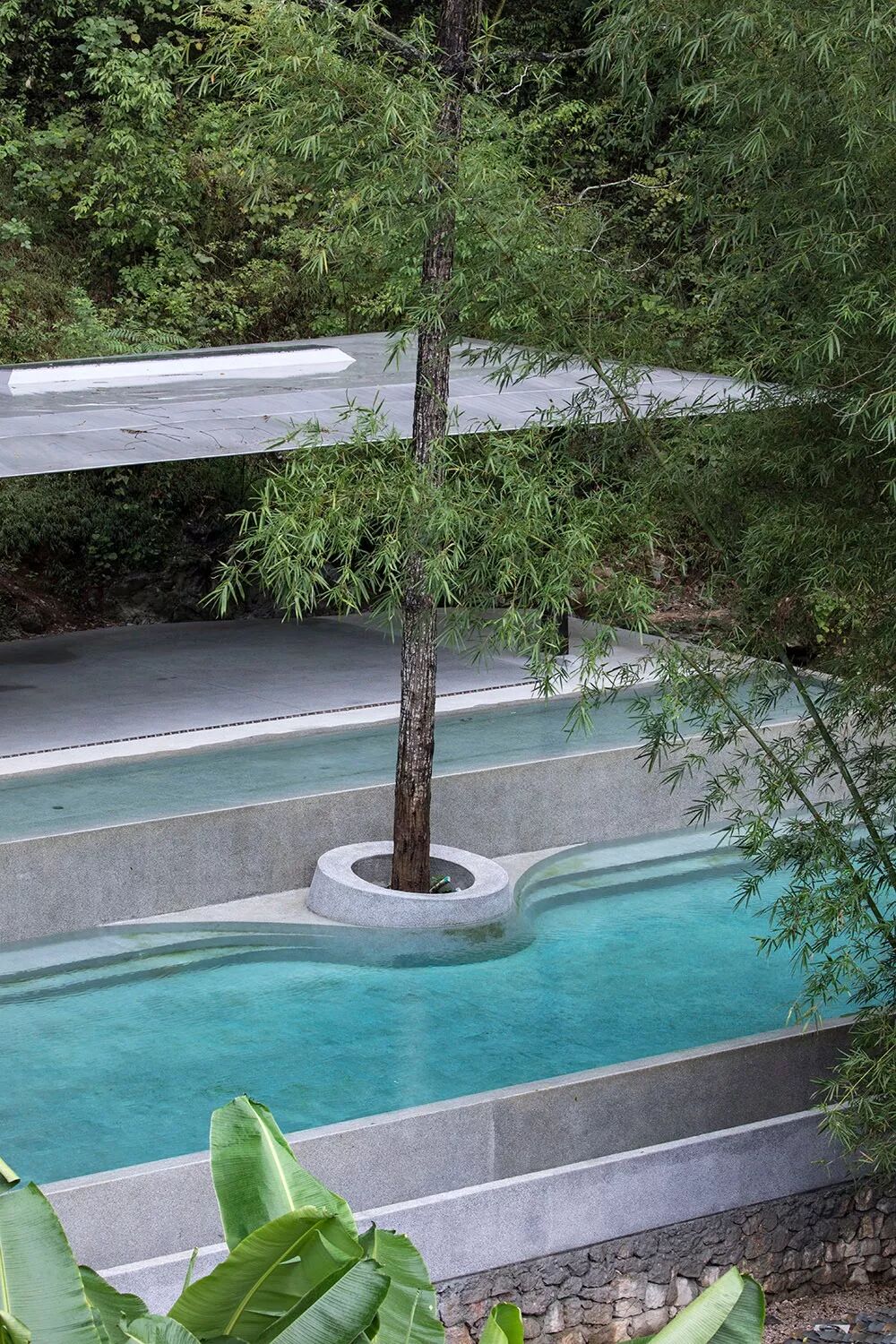 泳池占地范围同瑜伽亭相当。泳池以东侧台阶处作为入口,西侧环绕孤石以弧线边界收尾。入口平台东侧设置按摩池,平台下方借助高差布置50平米的泳池设备间。地势低处为无边界泳池, 高处是镜面浅水池。低池深而近路,可望村、望树、望石。高池浅而近亭,可观山、观云、观星。同时为顺应周边环境,场地上原有的无患子也得以保留,结合座椅台阶形成特色树池。设计方案在有限的条件下,争取最合适的树池范围,回土到原有标高,并配合景观植栽措施,在业主,施工方及景观顾问的协力合作下才实现了这次“保树”任务。