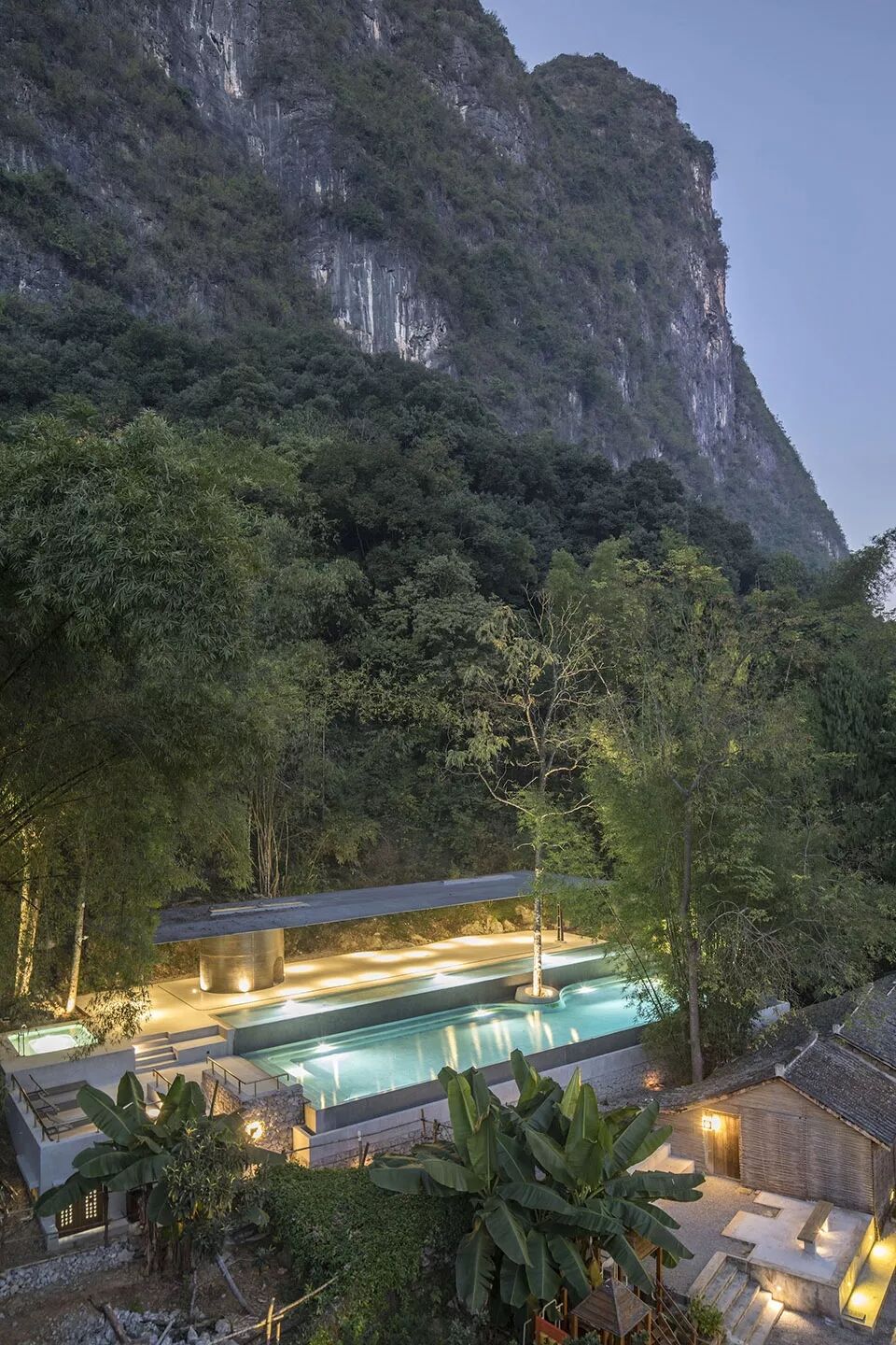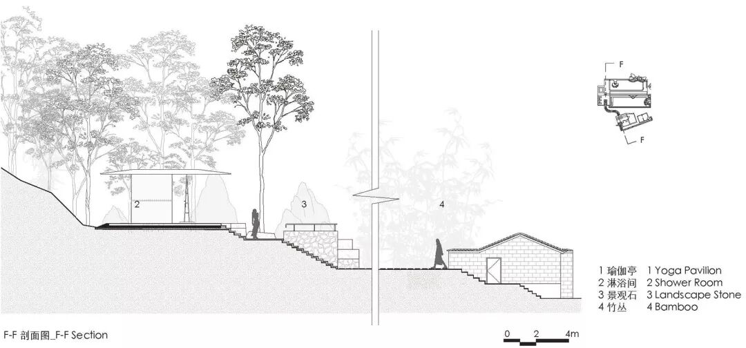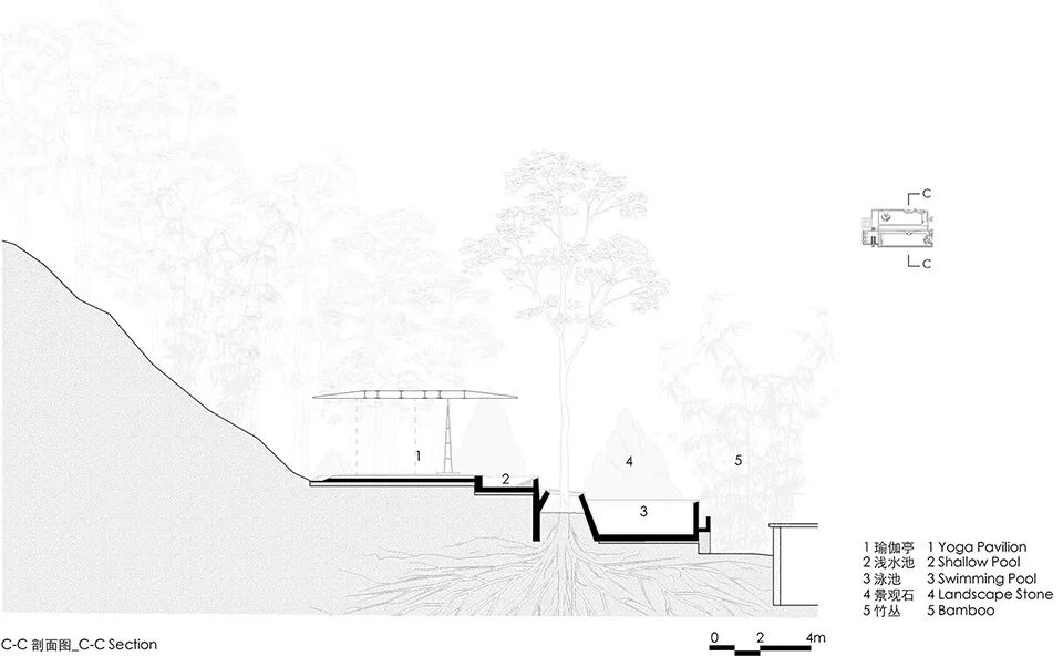 项目位于云庐酒店所在的杨家村背后的山脚下的一个台地上。透过对场地进行最少量的平整和对周边植被及景观视野的最大保留,设计将一组近乎等比例、等面积的泳池和瑜伽亭平行并置于场地当中,形成整个酒店空间序列的制高点。