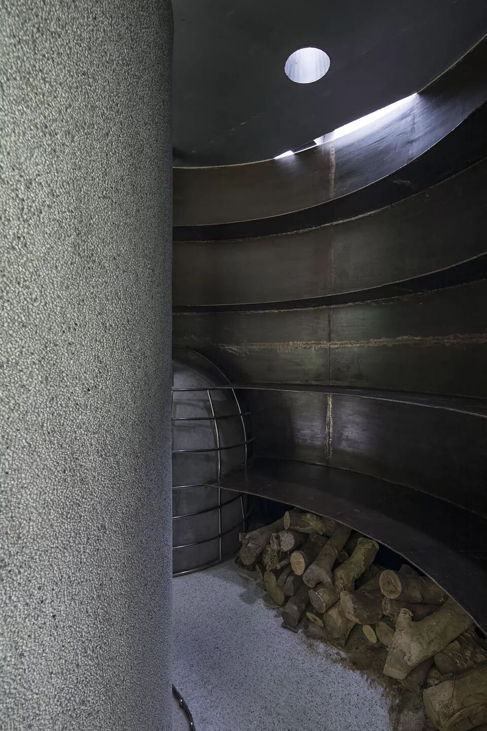 ▼弧形钢板正面嵌入柴火壁炉 ©田方方