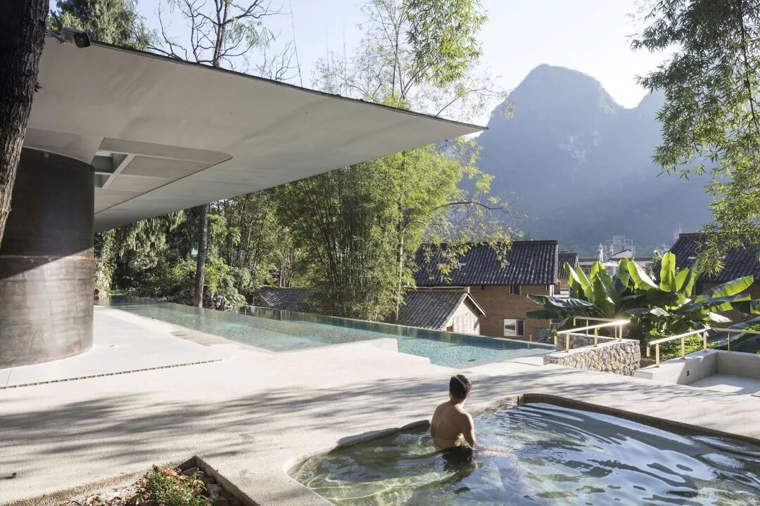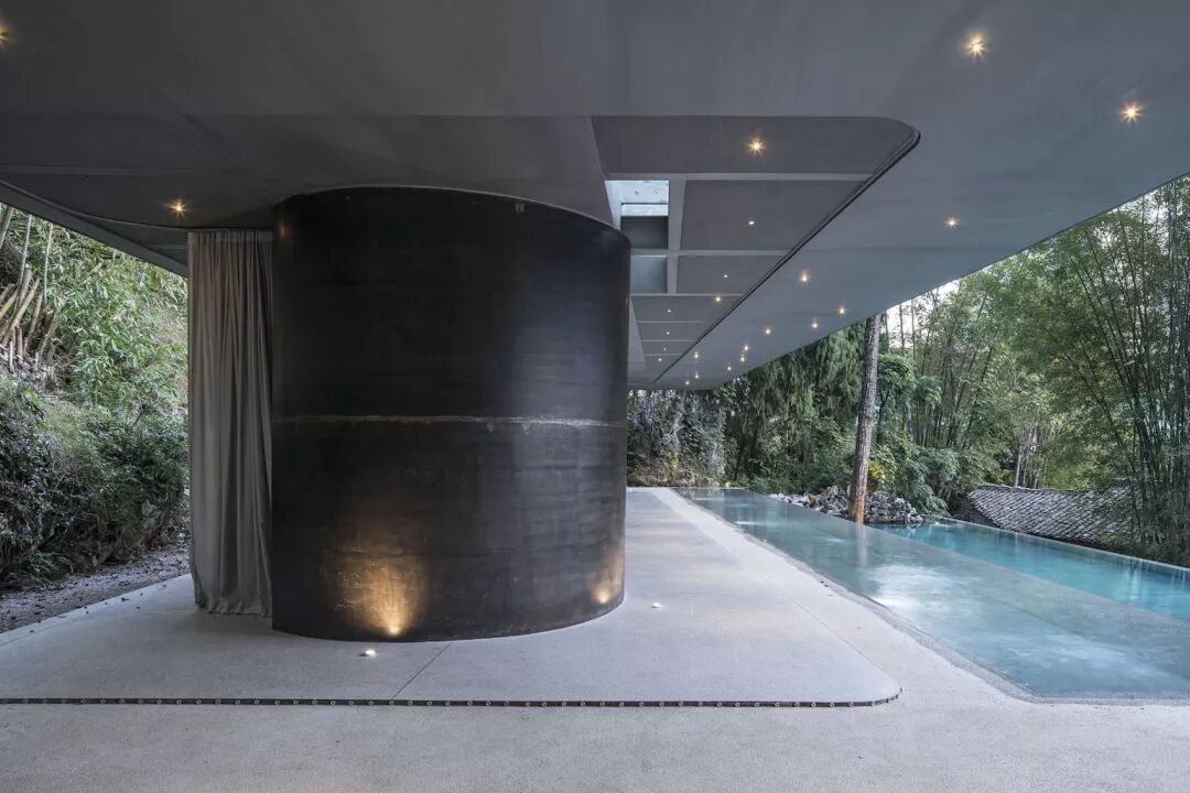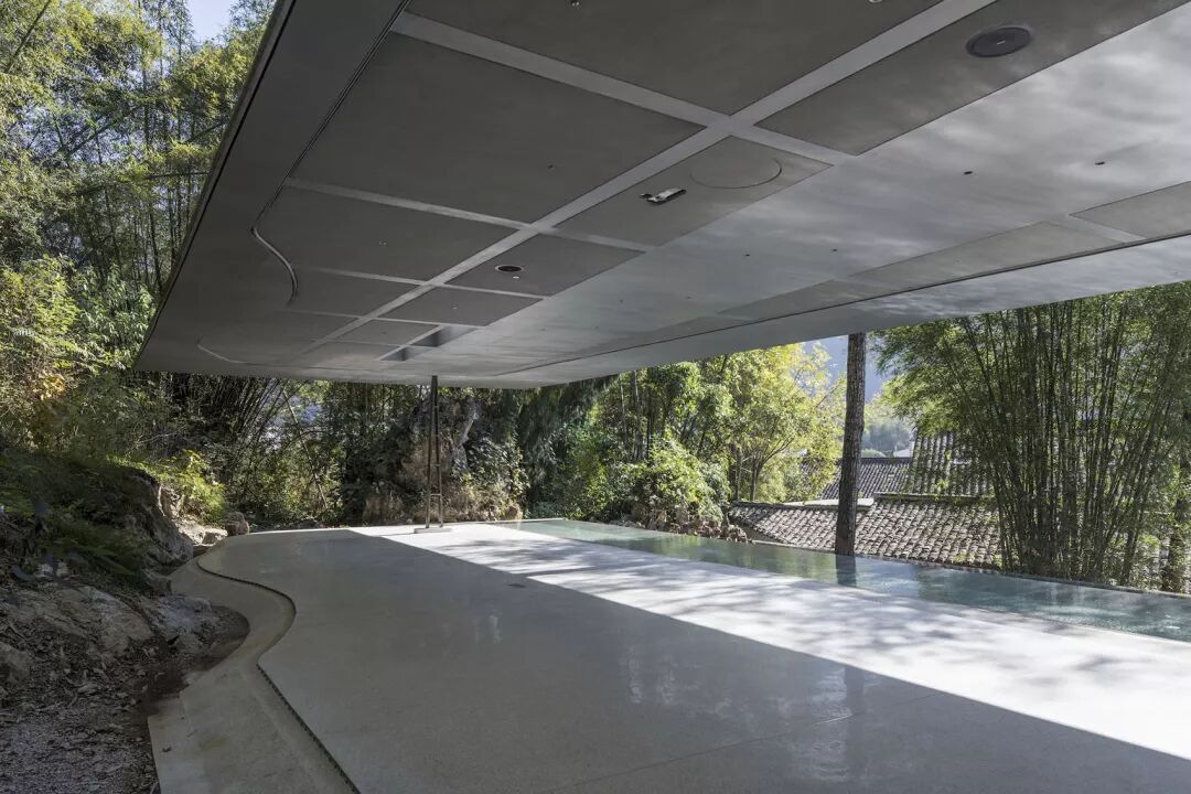 泳池面层采用灰白调的水洗石,通过富有手工感的材料施作,水下台阶及座椅呈现舒适的弧度及转角处理。一百多平米的泳池范围内,伴随树影及山石,有多处可游可躺可坐的角落及空间。水平延展的大屋顶悬挑于浅池上方,亦晴亦雨均可赏景,此处朝南远望,澄明宁静的水波涟漪映衬着竹影、村落、如黛青山。