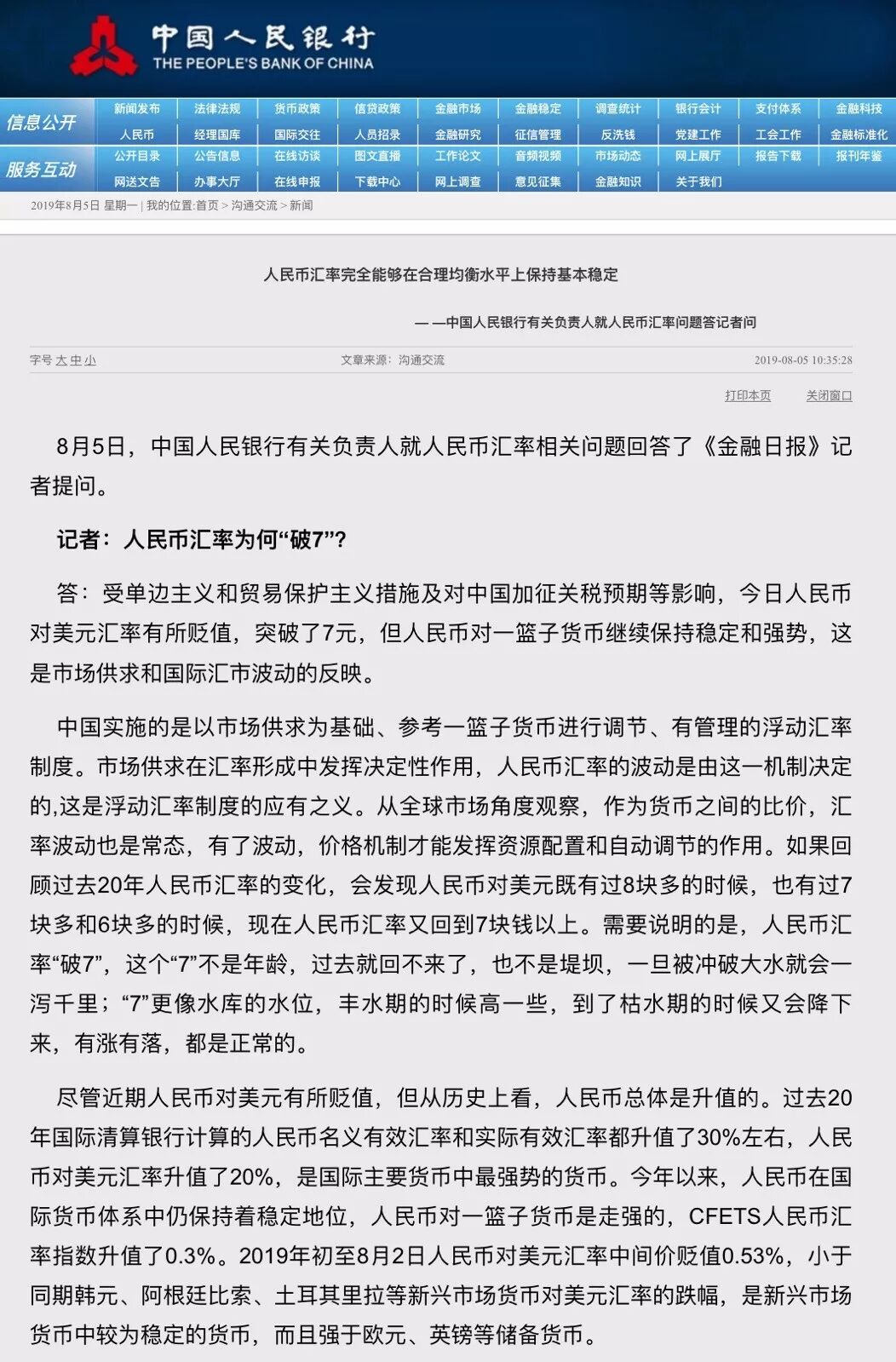 不知道大家有没有注意到时间,央行对人民币破七的回应是10:35分,距离9:33分破七仅仅1个小时零2分钟,回应的形式是答记者问,在这么短的时间里准备1500字的文稿并请来金融时报的记者,很值得玩味。