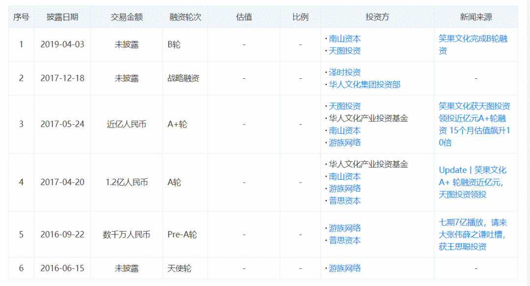 2019年4月,笑果文化完成B轮融资,投资方是天图资本和南山资本,完成第二次跟投后的笑果文化,估值达30亿。