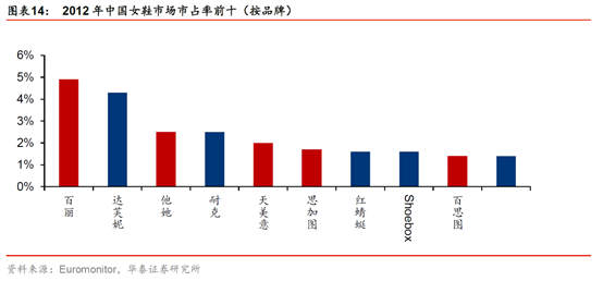 2012 年,百丽旗下品牌在中国女鞋市场占有率排名前十位中占有5席,公司整体市场占有率高达12.9%,成为当之无愧的鞋王。
