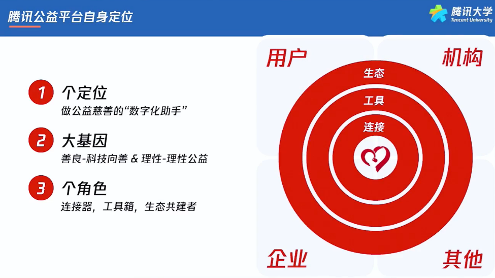 腾讯公益的定位是和腾讯一脉相承的。腾讯的定位是做各行各业的数字化助手,自然,腾讯公益的定位就是做公益慈善行业的数字化助手。腾讯公益的滚烫血液里还流淌着两大基因,其一是「善良」,即秉承科技向善的理念,通过先进的技术与工具去助力慈善行业发展;其二是「理性」,即倡导理性参与的理念,不以苦穷惨或极端事件去博取眼球,而是以高质量的项目和高质量的机构实力来获得捐赠用户的长期支持。为了落实这个定位与践行这些理念,腾讯公益担任着三合一的角色。第一个角色是「连接器」,连接爱心企业、公益机构、用户以及各方力量(政府、媒体、创意传播机构、行业专家等等)。每一股力量都是一份善意,善意汇流成大爱。第二个角色是「工具箱」,为各个伙伴提供平台、技术、工具方面的帮助与支持,包括借用微信端触达十多亿用户。第三个角色是「生态共建者」,目前腾讯公益生态已形成一个有机的循环。生态方面,公益机构通过腾讯公益所提供的工具不断地去连接公众。然后公众被公益项目吸引,捐赠之后,公益机构又可以通过腾讯公益平台去进行项目进展、财务披露的公开与反馈,告知公众,他们的善款去向与用途。让你捐出的每一分钱,都能追踪流向。这样的念念不忘必有回响,又获取了公众的信任,鼓励他们再次参与善事。这就形成了一个闭环,在这个循环当中又有了一个新的角色诞生,就是爱心企业。腾讯作为生态的共建者,让公益大森林中的每棵大小树木获得阳光雨露,共建共享繁荣生态。「99公益日」是腾讯公益首创、牵头联合数百家公益组织、知名企业、明星名人、爱心媒体,共同发起的一年一度的全民公益活动,已成为国内最大的全民公益节日。数据显示,在过去的几年间,「99公益日」善款总额从最初的2.28 亿元增长到30亿元。如今,走过6载的「99公益日」已经成为中国互联网的公益样本。用互联网的思维去做公益,起初是一件比较新鲜的事情。在传统公益行业耕耘已久的公益伙伴们虽说有了很多的经验与成就,但他们并不太懂互联网与公益究竟如何结合。他们对「私域流量」「竞价广告」「精准分发」等互联网老生常谈的词语一知半解,对怎样打造、怎样参与互联网公益项目更是满腹疑团。为了交流能够更顺畅,也为了以后有更多深度合作的可能,腾讯公益做的第一件事是「走出去」——从北上广到县城、乡村,到各个优秀机构去做拜访和交流,首先了解公益项目的运营实况。第二件事是「分享与讲解」——把互联网的语言、腾讯的语言转化成公益机构能够听懂的语言。第三件事是「顶层设计的搭建」——建设平台,通过中国互联网公益峰会,让所有相关的政府部门、媒体人、行业专家共同参与、共同发声。例如,在专家侧,举行沟通会,专家提了很多关于配捐的建议,并对99公益日的规则进行审理。