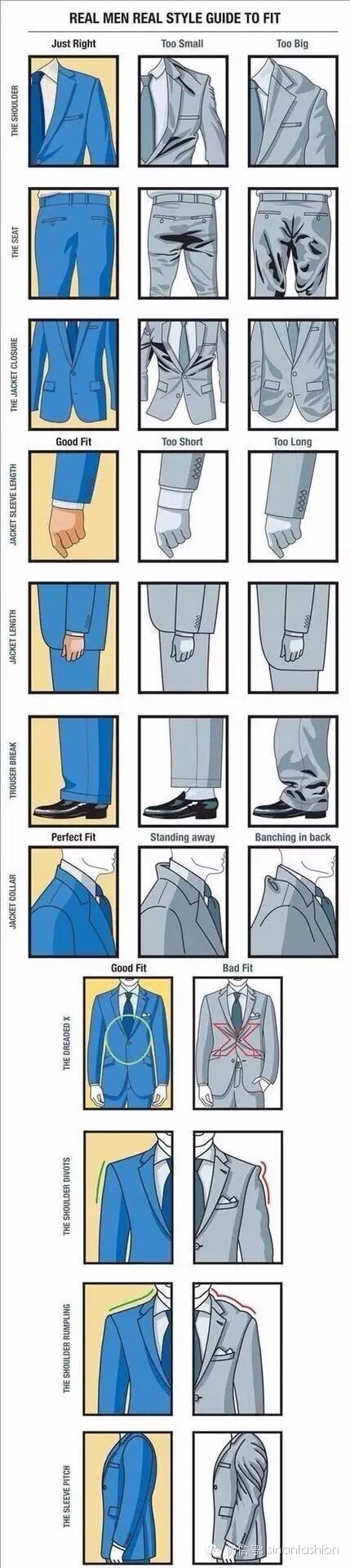 首先,就像刚开始介绍的一样,西装最重要的一点就是合身。之前我们在自从学会了这16条tips,500块的西服被我吹成了5000块中也介绍过这个图片,今天再放出来一下。