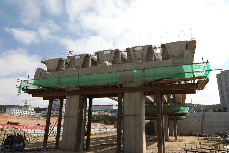 该项目2022年3月15日开工,总投资4746.24万元,先后组织修建完成部分拆迁、项目部及梁场等附属设施。目前完成总工程量的65%。主路路线长度为426.521m,北辅道路线长度256.481m,南辅道路线长度251.763m。在高架桥段设置3*30+3*30m的装配式预应力箱梁,城市主干路标准,设计时速40km/h,主线红线宽度25m,引道段、高架桥段红线宽度28m。![]()