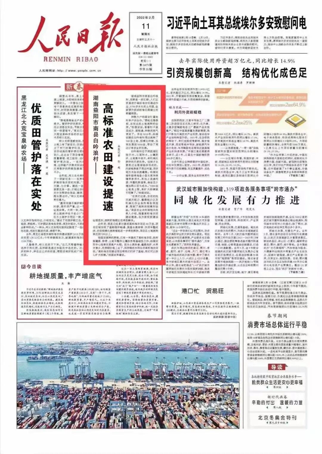 2月11日,人民日报头版刊发《湖南益阳市南县白吟浪村——高标准农田建设提速(新春走基层)》,详情请看↓↓↓