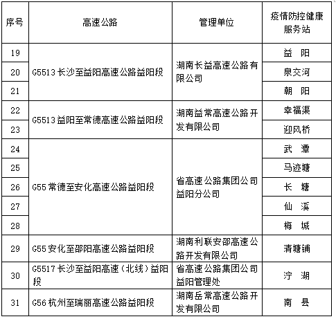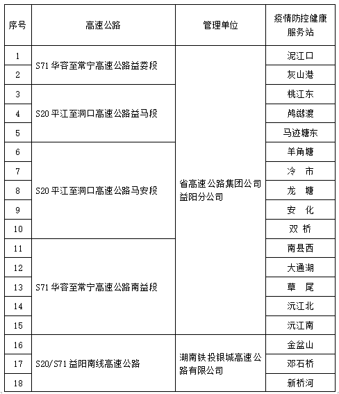 为切实落实交通运输环节“外防输入、内防反弹”的工作要求,有效阻断疫情传播,按照湖南省新冠肺炎疫情防控指挥部“迅速对疫情防控提档升级管控,坚决巩固疫情防控的屏障,防止出现输入性疫情”的工作要求,市新冠肺炎疫情防控指挥部决定从即日起,在我市各高速公路收费站(见附件)设置疫情防控健康服务站,现将有关事项通知如下: