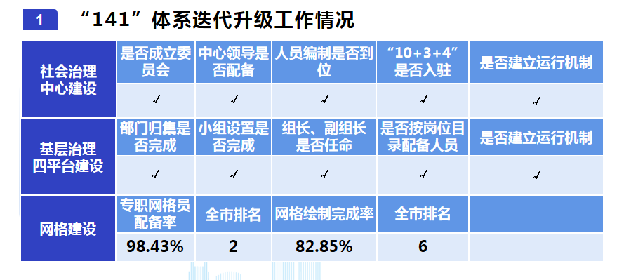 迭代升级“141”体系,社会治理中心机构设置、人员编制等全部到位,并建立了规范化运行工作机制;基层治理四平台部门归集、小组设置等全部完成,并已建立“四图四制度”运行机制;网格建设已实现网格员配备率98.43%、全市第二,网格绘制完成率82.85%、全市第六。一体化智能化公共数据平台组件上架5个、全市第三,七张问题清单、E行在线、社区矫正、防汛防台等省级重大应用贯通情况分别列全市第七、第一、第一、第五。7大重点任务共争取省级试点18个,其中基层治理“一件事”集成改革2个,基层智治大脑建设1个,“大综合一体化”行政执法改革1个,完善“四治融合”城乡基层治理体系1个,共同富裕现代化基本单元建设13个。