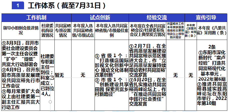 实行领导小组例会、专班实体化推进等工作机制,扎实开展“扩中”“提低”共富大行动。其中,入选共同富裕最佳案例省级1个、市级1个;横店集团先后在全省共同富裕推进大会、全省共同富裕高峰论坛上交流发言。2021年11项年度指标中,居民人均可支配收入与人均GDP之比、生活垃圾分类覆盖率等2项指标居全市前三,5项指标居全市中游;1-7月23项指标中,居民人均可支配收入、城乡居民收入倍差等9项指标居全市前三,9项指标居全市中游。