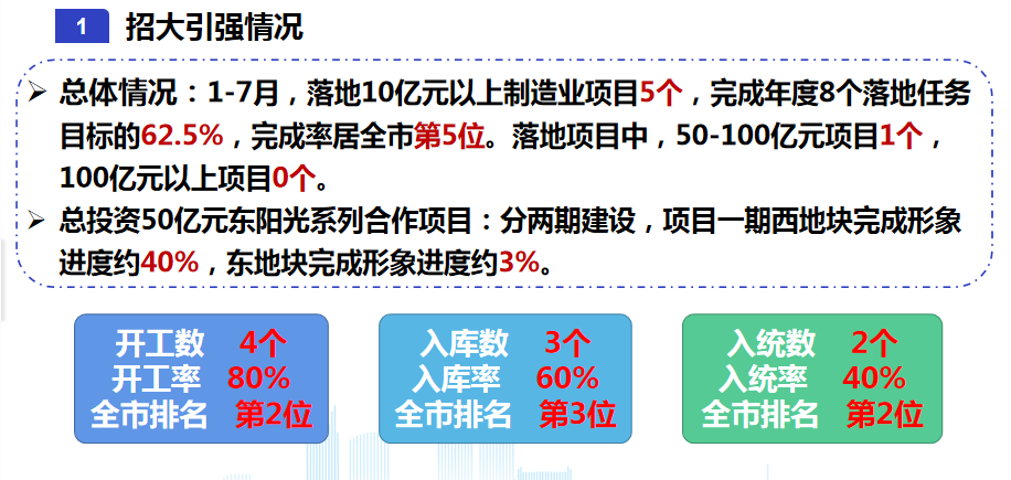 ①招大引强,落地10亿元以上制造业项目5个,完成年度落地任务的62.5%,其中开工4个、开工率80%、全市第二;入库3个,入库率60%、全市第三;入统2个,入统率40%、全市第二。落地50-100亿元项目1个,为东阳光系列项目,目前项目一期西地块、东地块分别完成形象进度40%、3%。