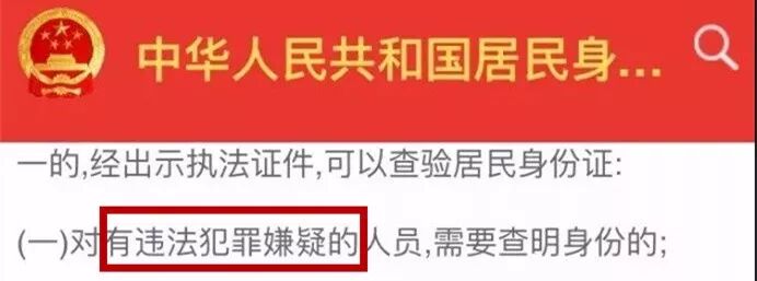 《中国人民共和国身份证法》第十五条第一款,就赫然写着:对有违法犯罪嫌疑的人员,需要查明身份的。这句话你看不懂吗?看不懂的话,我帮你翻译翻译。