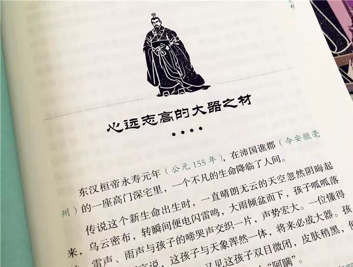 最精彩的是,每个人物经历都通过一连串精彩的标题串联起来,哪怕只看标题,就已经牢牢抓住了孩子的注意力。比如,讲到一代枭雄曹操,说他是心远志高的大器之材,首先介绍了他的出生及少年成长经历。