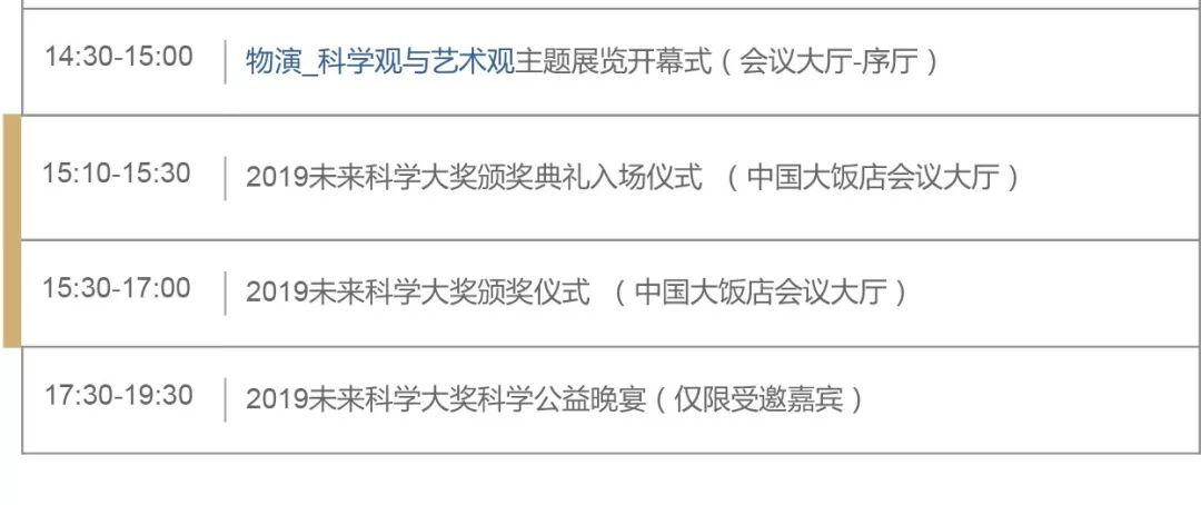 2019未来科学大奖周,主要议程包括3场获奖人学术报告会,对具备前沿、交叉、应用特征的学科或领域进行深入探讨的8场专题研讨会的高峰论坛,15场主旨演讲的科学峰会,由历届获奖者与国际知名艺术家首度联袂创作的“物演——科学观与艺术观”主题展览,以及未来科学大奖颁奖典礼。