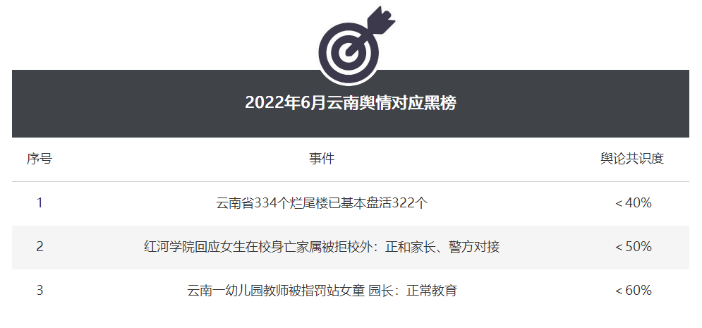 舆情应对黑榜中,“云南省334个烂尾楼已基本盘活322个”未获得舆论认可,网民认为开工不代表竣工,盘活标准和老百姓的认知差异有点大,这种文字游戏毫无意义;舆情应对红榜中,“云南省教育厅成立工作组调查‘网传罗崇敏发表有关言论’事宜”引发舆论关注,相关信息发布后,网民纷纷转发并呼吁相关部门严查,及时发布调查信息,有利于避免谣言传播,使舆情趋于平稳。