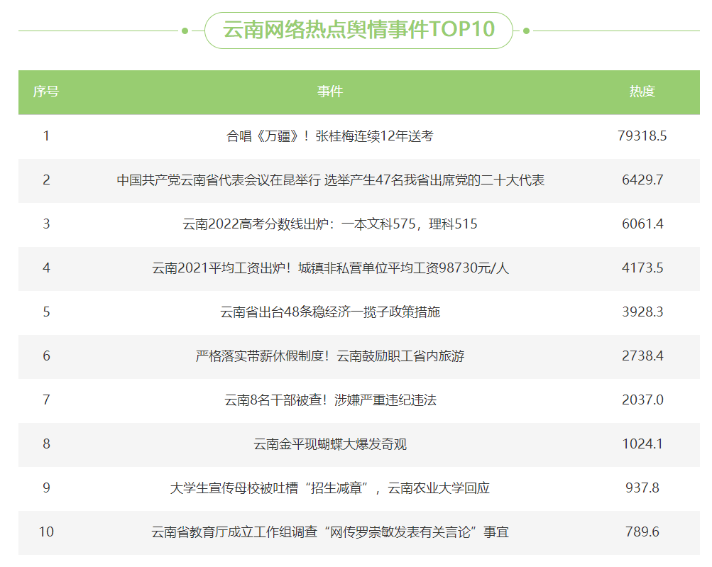 本月“云南网络热点舆情事件TOP 10”榜单上,“合唱《万疆》!张桂梅连续12年送考”引发舆论高度关注。“中国共产党云南省代表会议在昆举行 选举产生47名我省出席党的二十大代表”“云南2022高考分数线出炉:一本文科575,理科515”分别排在第二、第三。此外,“云南2021平均工资出炉!城镇非私营单位平均工资98730元/人”“云南省出台48条稳经济一揽子政策措施”“严格落实带薪休假制度!云南鼓励职工省内旅游”等事件都见诸榜上。