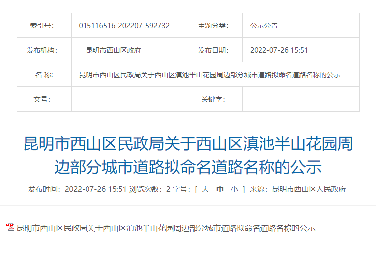 7月25日,昆明市西山区民政局发布《关于西山区滇池半山花园周边部分城市道路征求意见的公示》,涉及滇池半山花园周边8条城市道路,其中部分街名源自典故,如“沐春街”取名自宋朱熹《伊洛渊源录》,“望舒街”取名自《楚辞·离骚》,“暮雨街”取自苏轼《浣溪沙》。
