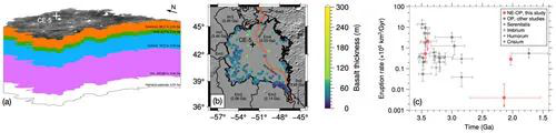 (a)嫦娥五号着陆区各下伏玄武岩单元的厚度。(b)Em4与Em3单元厚度之和的空间分布。(c)嫦娥五号着陆区以及月表其他地区玄武岩岩浆的喷发率。(中科院国家空间科学中心供图)