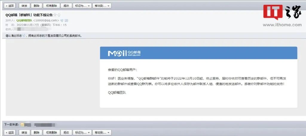 11月17日,QQ邮箱发布“群邮件”功能下线公告,公告称因业务调整,“QQ邮箱群邮件”功能将于2022年12月10日起终止服务。该功能终止服务后,届时用户依然可查看历史群邮件,但不可再发送新的群邮件或查看QQ群列表。官方还称,用户可以将多位收件人保存为邮件联系人组,便捷地发送邮件。