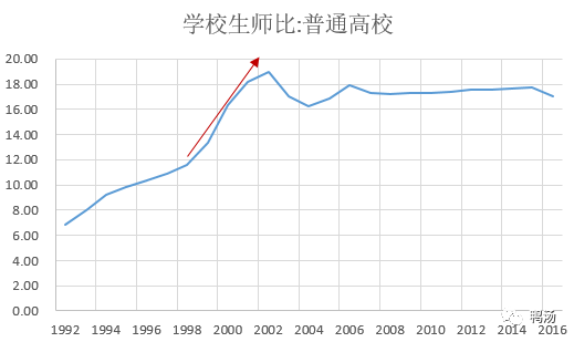 高校招生规模迅猛扩张导致我国的普通高校生师比(注意,这个指标是包含研究生和本科生的生师比)逐年攀升。