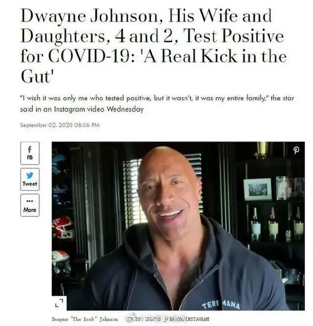 据外媒报道,美国著名影星巨石强森周三(9月2日)在个人社交网站宣布,他与妻子及女儿对新型冠状病毒(COVID-19)的测试结果均呈阳性。