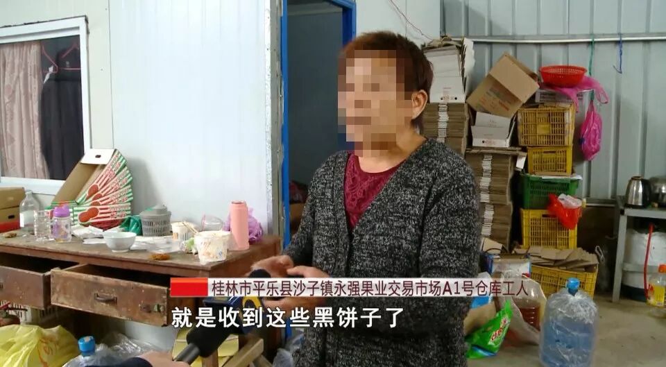 桂林市平乐县沙子镇永强果业交易市场A1号仓库工人:在什么情况下(会染色),就是收到这些黑饼子了 把它上点色,就跟好饼子不就一样色了 , 有烂的 有黑的,也得卖啊 ,你要是不卖 ,你不就赔钱了嘛。