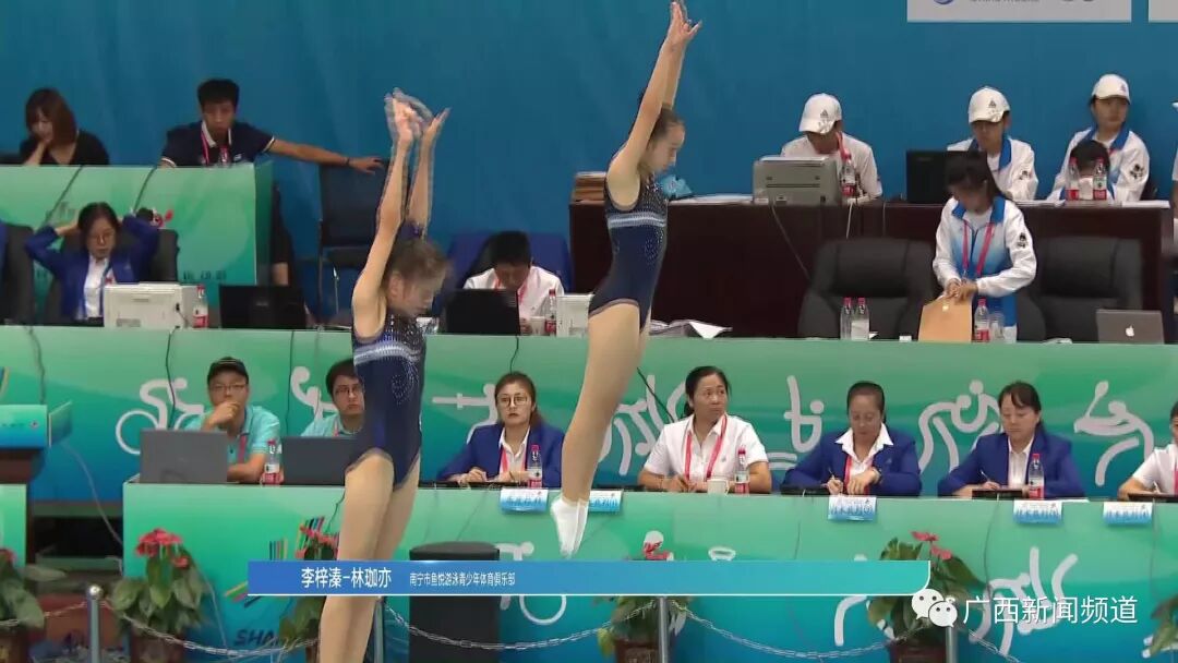 昨天是二青会蹦床比赛社会俱乐部组的最后一个比赛日,南宁鱼悦青少年体育俱乐部的李梓溱、林珈亦代表广西队参加社会俱乐部甲组女子双人同步的比赛。决赛中,两人配合默契,曲分跳的空中姿态非常漂亮,可惜难度分比较低,最终这对组合获得了24.840分位列第三。东道主山西省吕梁市队的组合凭借难度分高达5.3的一套动作获得冠军。