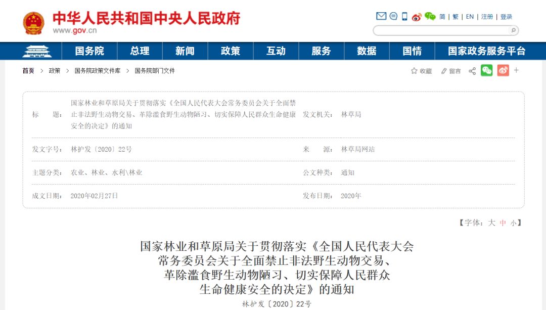 2月27日,国家林业和草原局发布关于贯彻落实上述决定的通知。