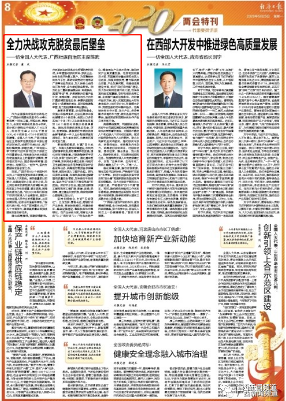 《经济日报》今日刊登《全力决战攻克脱贫最后堡垒 ——访全国人大代表、广西壮族自治区主席陈武》,现全文转发如下: