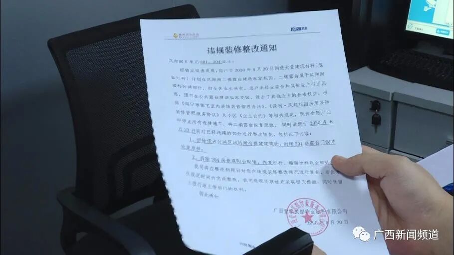 南宁保利凤翔花园物业公司工作人员 王小姐:去年年底他们就开始装修了,二楼有个大平台的公共区域那里,物业有出过两次那个整改单。(记者:就是说已经告诉他了?有用吗?)没有用。