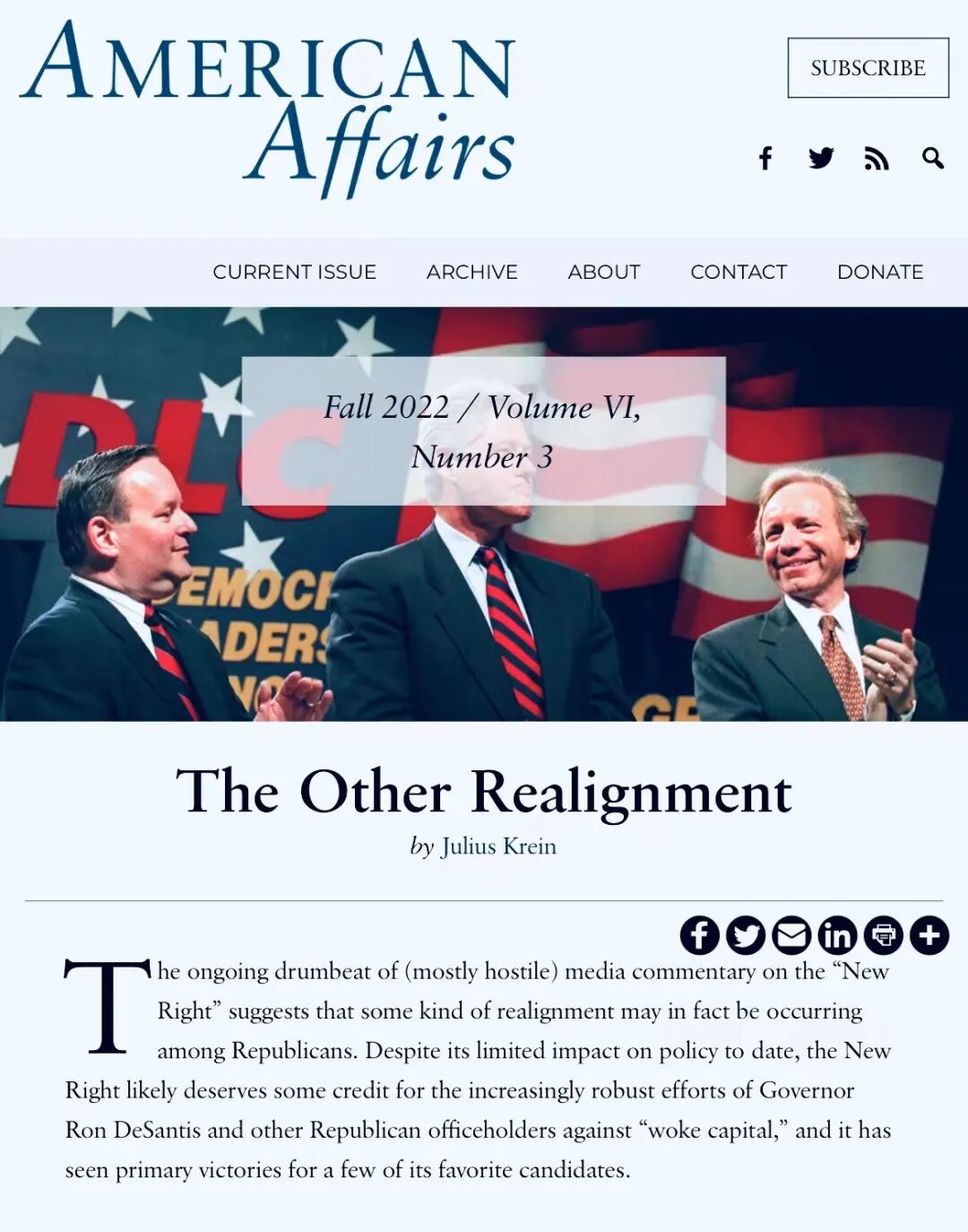 媒体对“新右派”(New Right)的热切评论表明,共和党内可能正在发生某种“重组/洗牌”(realignment)。尽管到目前为止,新右派对美国政策的影响有限,但佛罗里达州长罗恩·德桑蒂斯(Ron DeSantis)和其他共和党政客针对所谓“警醒资本”(woke capital)所做的反抗努力正在逐渐见效。(译者注:当前,德桑蒂斯一般被认为是美国共和党“新右派”的代表)事实上,新右派的一些代表人物也在近期的选举中获得了胜利。