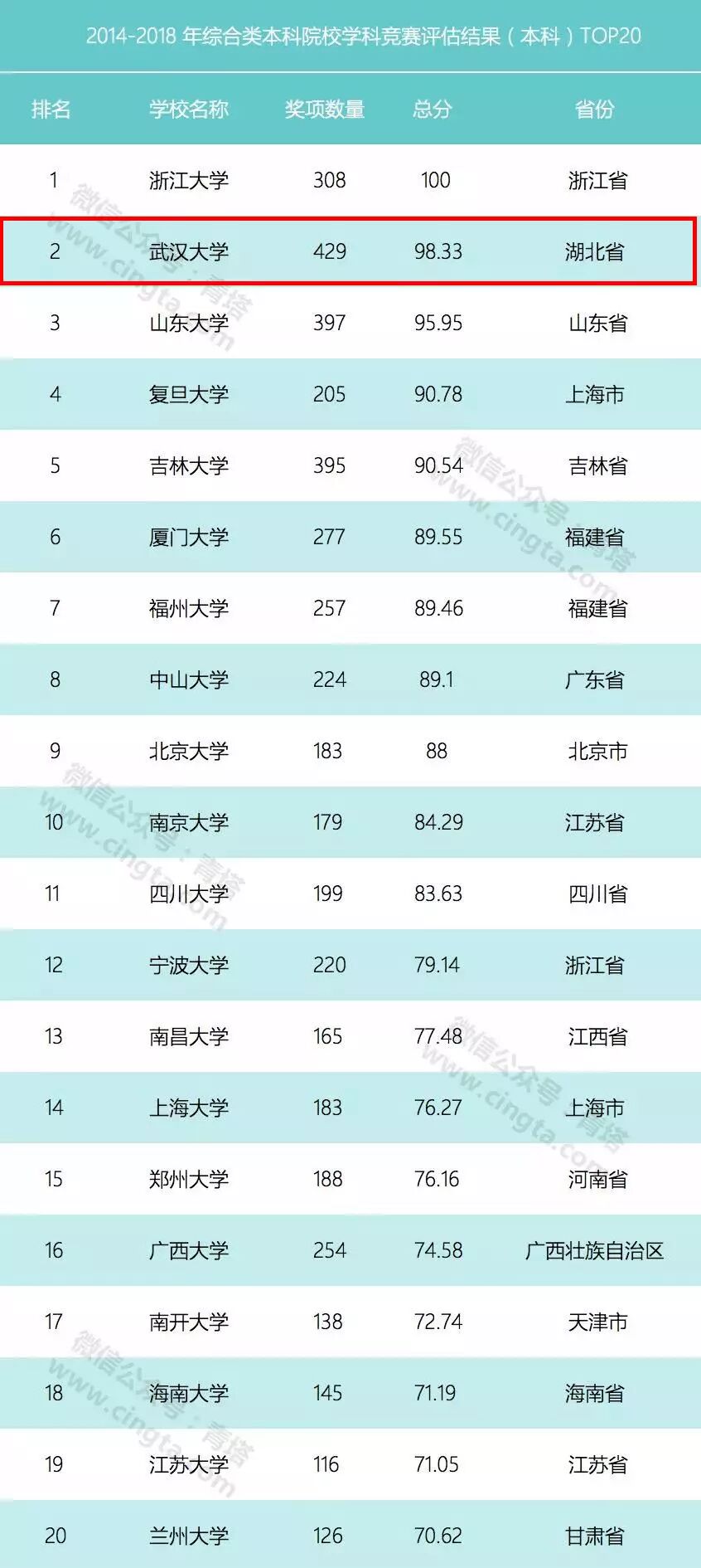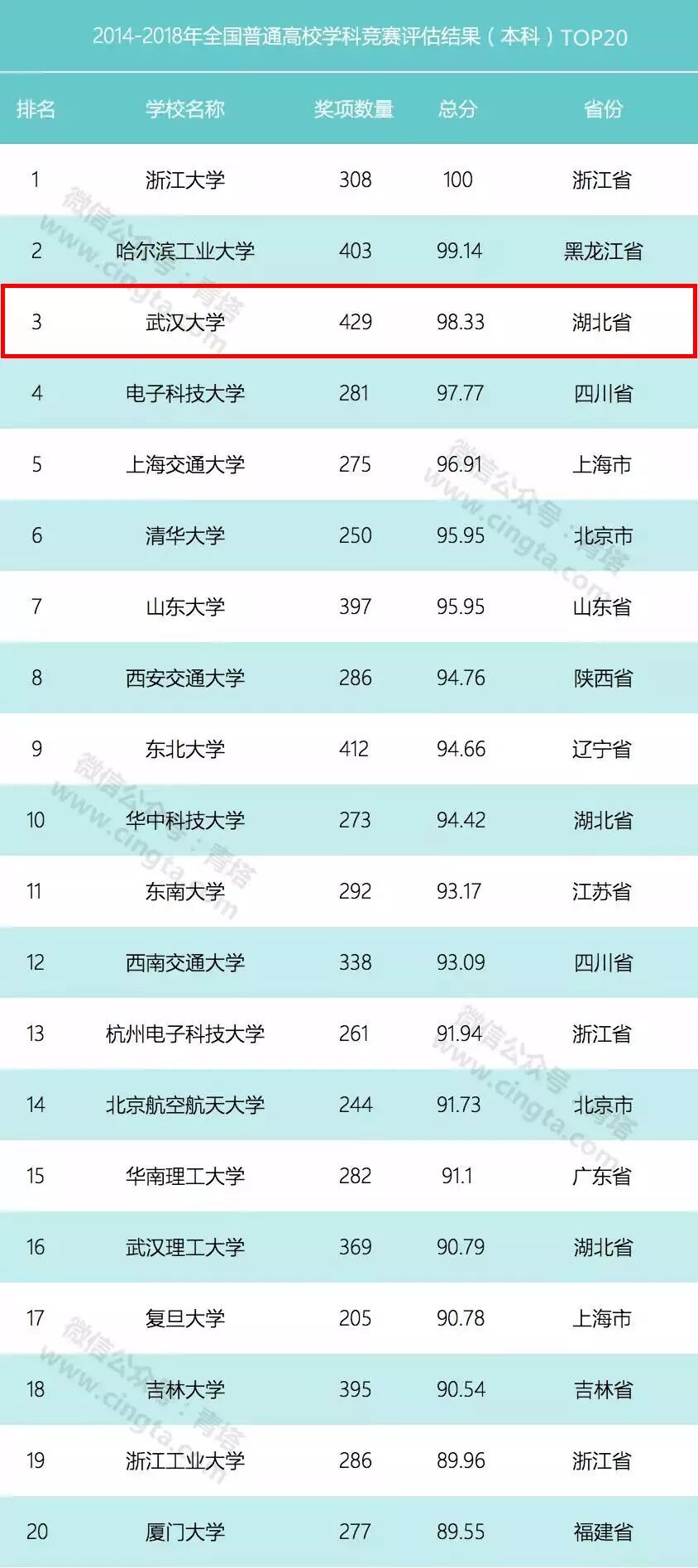 2月22日,中国高等教育学会在杭州正式发布2014-2018年中国高校创新人才培养暨学科竞赛评估结果,共揭晓12个榜单。在“2014-2018年全国普通高校竞赛评估结果(本科)”榜单中,武汉大学共有429项奖项,总得分为98.33,位居全国高校第三。