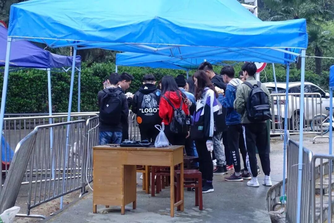 清晨,天色初晓,校园里已有不少游客赶早来参观游玩。刚过7点,鉴湖入口处的预约通道就陆陆续续有志愿者前来准备,等待8点预约验证工作的正式开始。