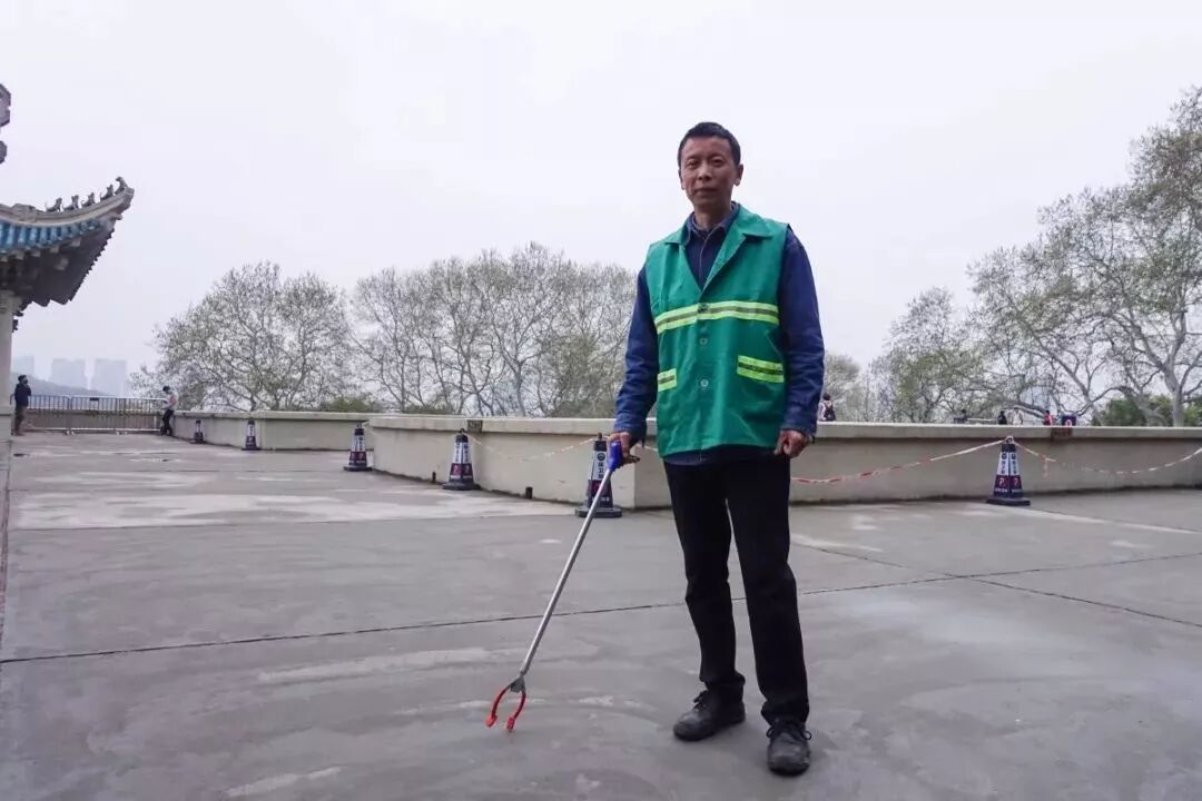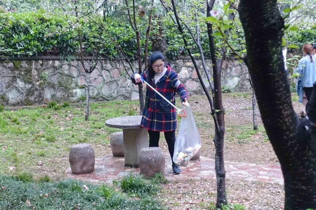 早晨7:50,清洁志愿者也开始了一天的工作。他们拿着长长的夹子和塑料袋,捡拾地上的垃圾,有时还会协助治安巡逻岗的同学劝阻游客拉扯花枝。