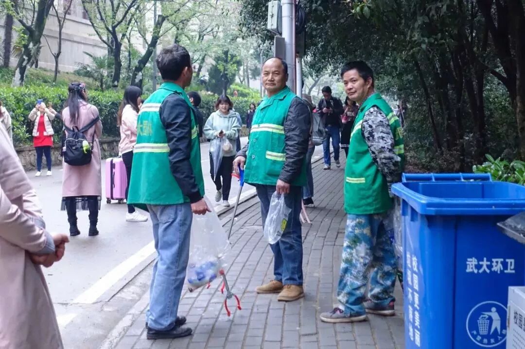 校园各处的环卫工人7:30就已经上岗,比志愿者来的更早些。他们的工作内容与清洁志愿者相似,不过由于樱花开放期间人流量远大于平时,简单的工作要不断重复,也造成了不小的压力。