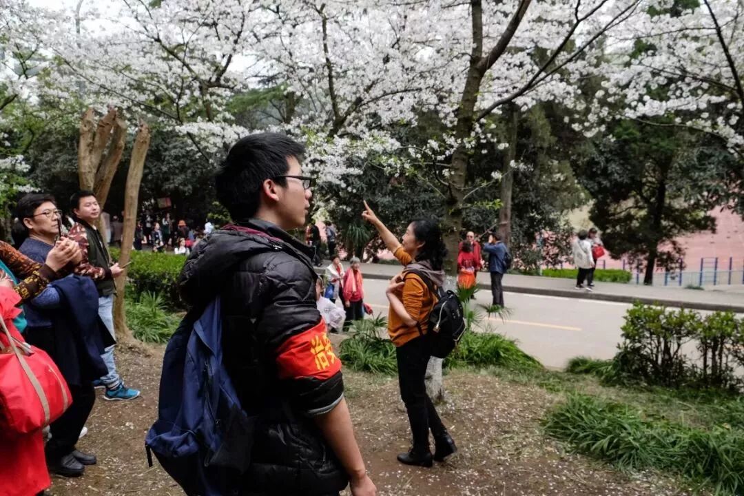 鲲鹏广场和樱花大道、樱顶上都有带着红袖标的志愿者,他们负责各区域的治安巡逻工作。游客过多时进行疏导、阻止游客翻越栏杆等危险举动、以及劝导拉扯花枝等不文明行为都是他们的任务。他们每天7:50到岗,在区域内来回走动,时刻关注着来来往往的游客。