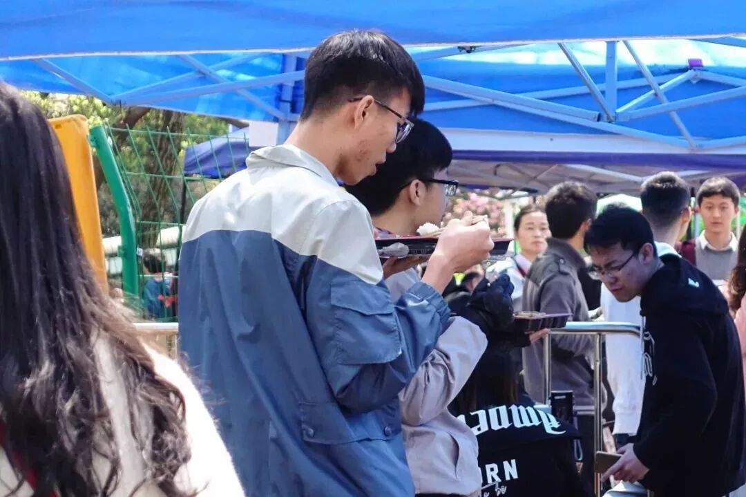 临近中午,人流量到了一天中最大的时候,各个预约验证通道前都排起了长队。午餐盒饭已经送来,志愿者们却无暇顾及,全身心地投入工作之中,只为游客能更快进入校园赏樱。等到人流量稍小一些,他们才能轮流坐下来休息吃饭。由于座位有限,一些志愿者站着匆匆吃完就又回到了工作岗位上。