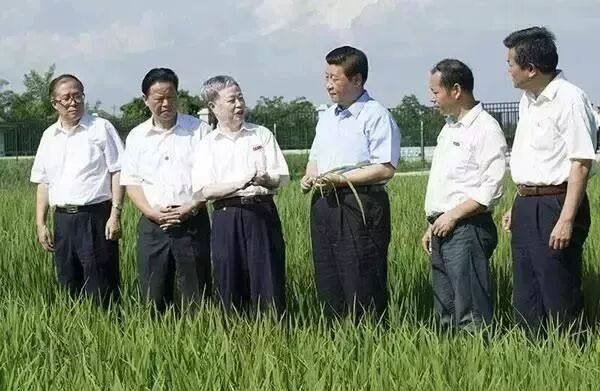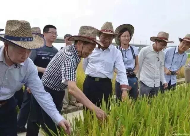 2013年5月,朱英国(左一)与袁隆平院士(左二)、谢华安院士(左三)等在海南考察红莲型水稻新品种珞优8号等产品
