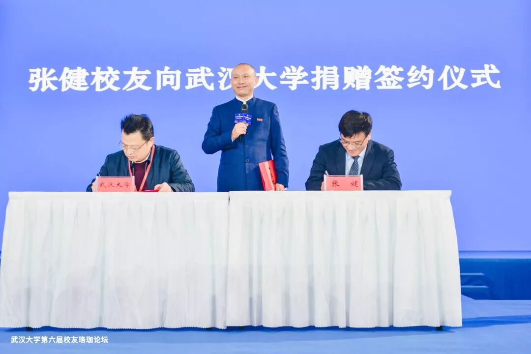 武汉大学副校长、中国工程院院士李建成与张健校友签约。