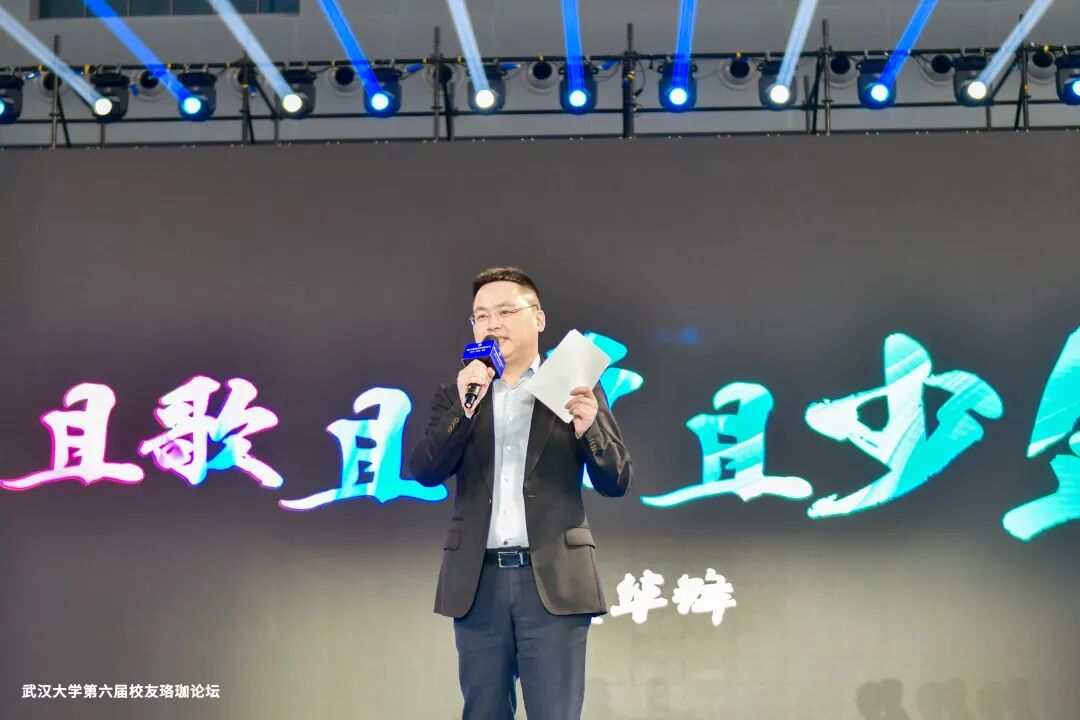 武汉大学2001级市场营销学校友、杭州铭师堂教育科技发展有限公司董事长兼CEO赵华锋发表《且歌且行且少年》主题演讲,希望大家牢记五个有:“心中有梦想,耳畔有歌声,沿途有风景,脚下有力量,身边有兄弟”。