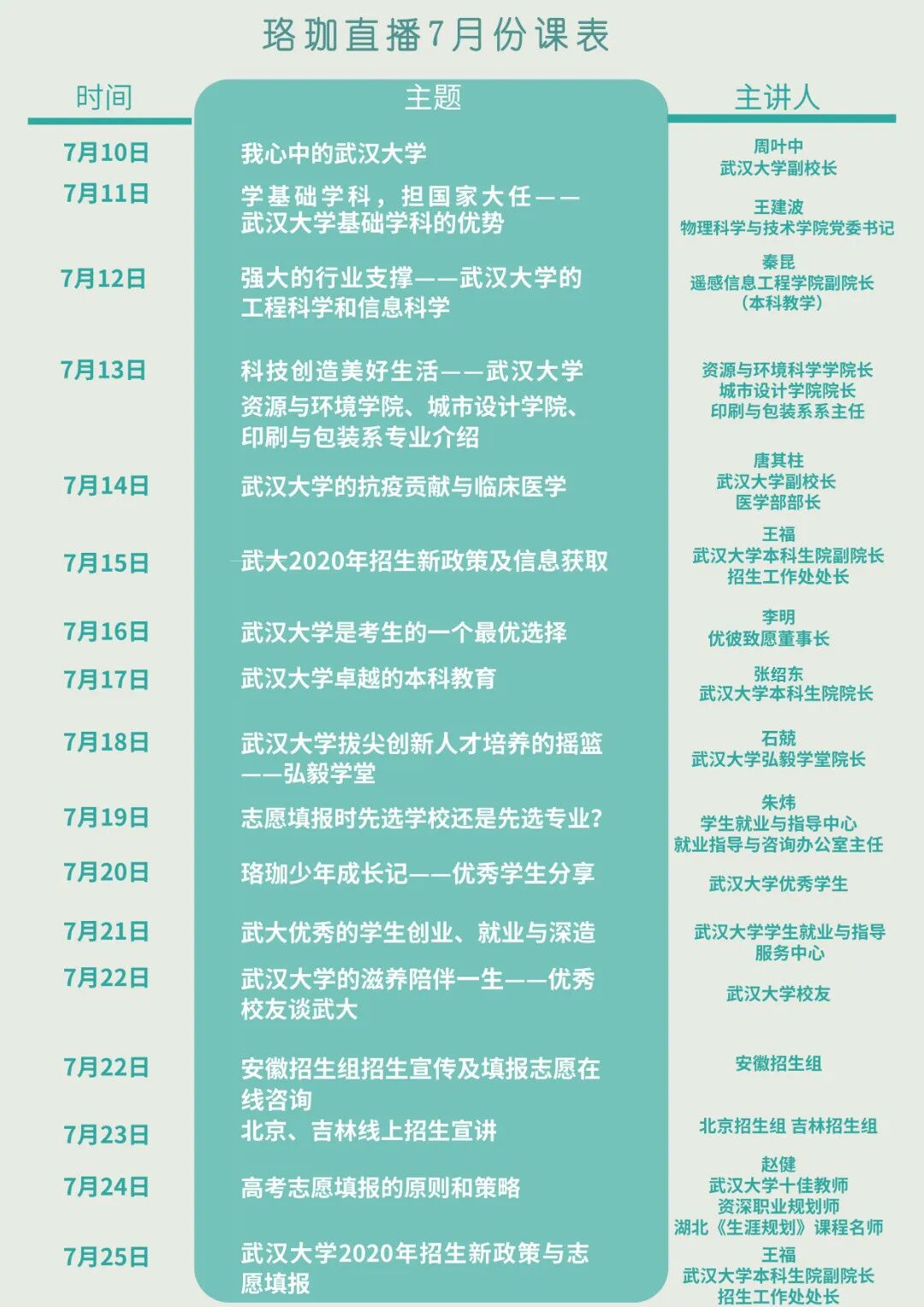 本场直播后将生成回放,倘若错过也可回看。七月珞珈直播回归,为迷茫于志愿填报的你提供最详尽的资讯与指南。后续直播预告将在“武大招办”公众号发布,敬请关注!
