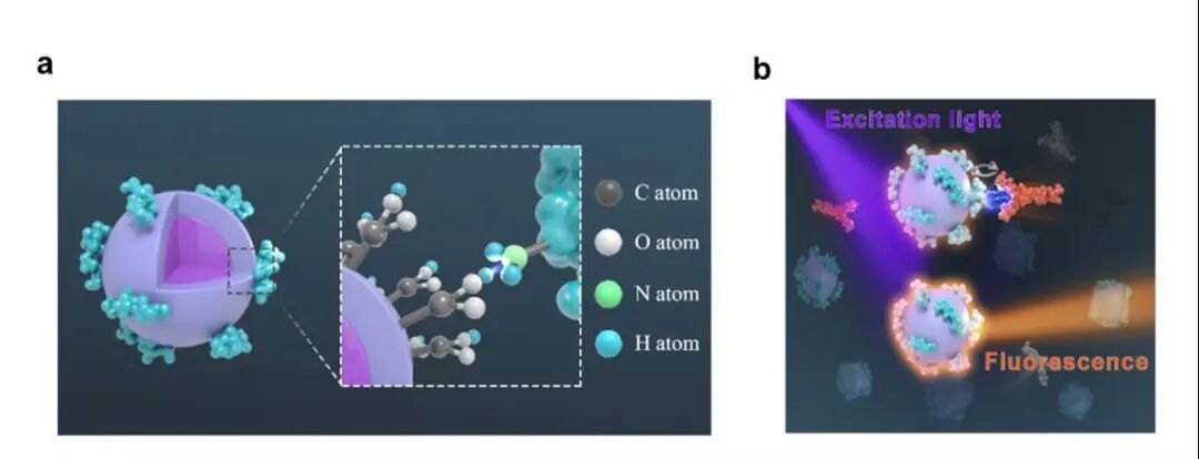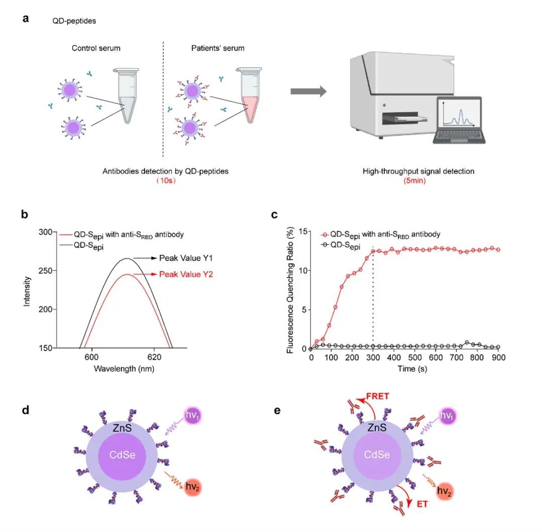 针对这一现状,徐可教授所在的联合团队另辟蹊径,将CdSe-ZnS荧光量子点偶联新冠病毒蛋白高特异性B细胞表位多肽,构成了纳米尺度的生物传感元件,可精准靶向病毒种属特异的识别表位,放大抗体检测信号,有效避免交叉反应,提高抗体检测的特异性。