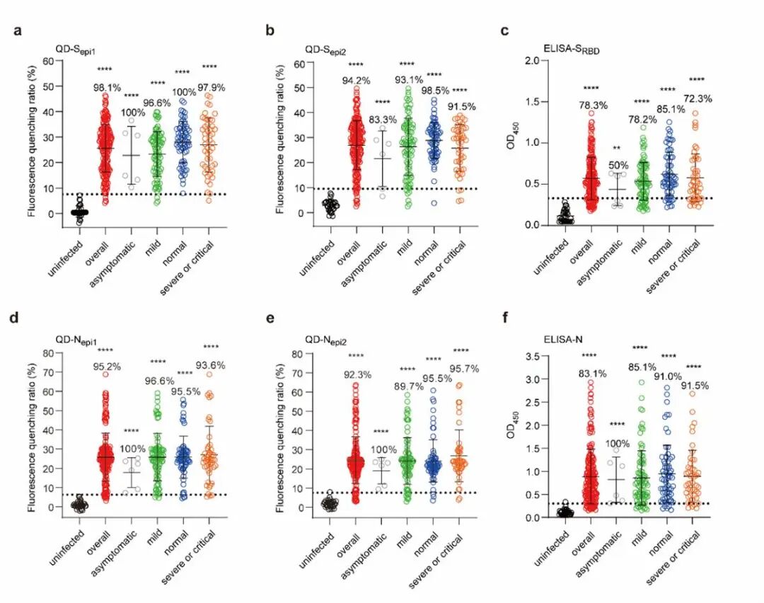 运用这种原理的生物传感检测时长仅为5分钟,且与其他常见人患冠状病毒商品化抗体无交叉反应。在207例新冠感染的康复病人血清检测中,获得了高达92.3-98.1%的抗体检出率,远大于传统全蛋白ELISA方法,并表现出更高的均一化检测结果。