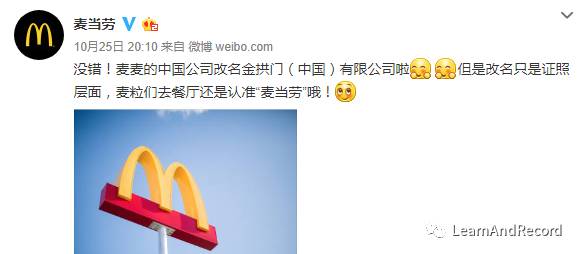 The U.S. fast-food giant has changed its official business name in the country, ditching* the previous one -- Maidanglao, a Chinese rendering* of its English name -- in favor of Jingongmen, which roughly translates as "Golden Arches."